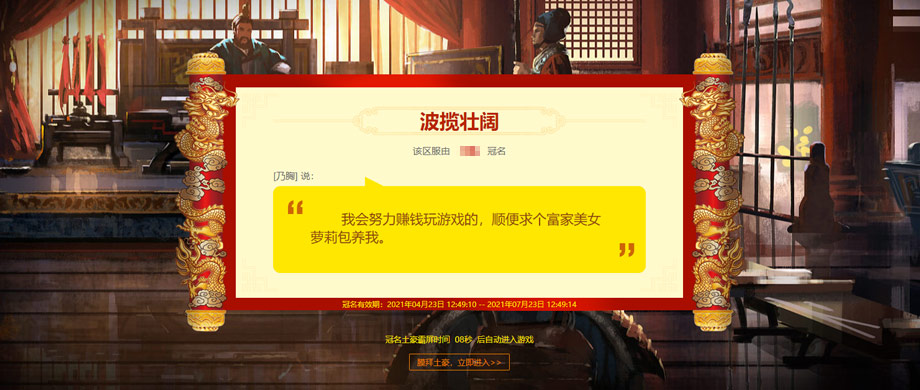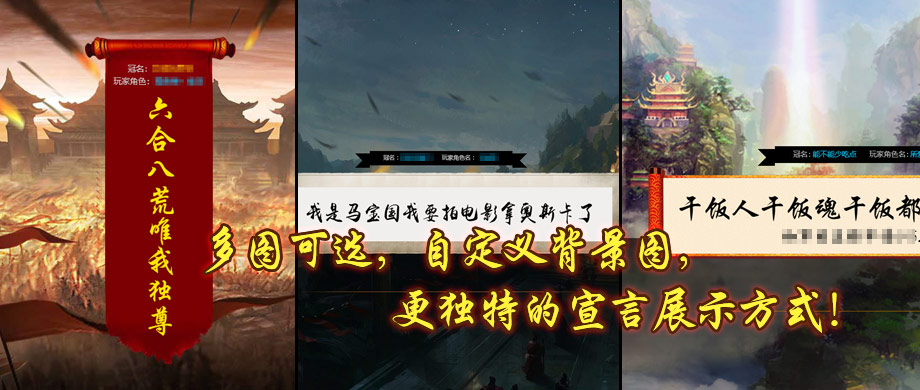 同一区服21天内累计自充值累计达到3000元的玩家,联系客服申请至尊冠名或替换高级冠名,额外赠送玩家宣言,可额外自定义超炫背景
